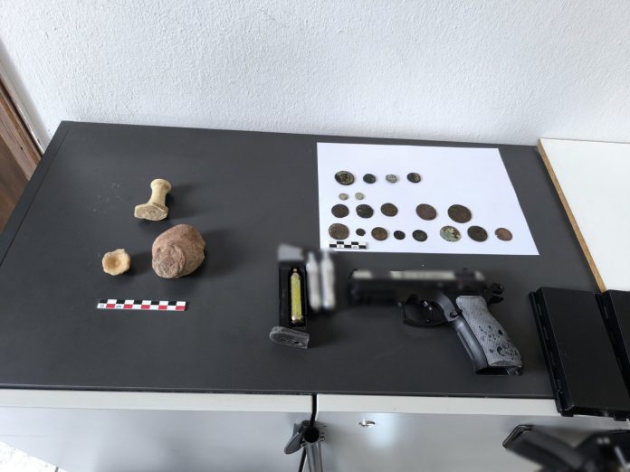 Κατασχέθηκαν, μεταξύ άλλων, -20- νομίσματα, -3- όστρακα μινωικής εποχής, αεροβόλο πιστόλι με γεμιστήρα και -3- αμπούλες αερίου, ανιχνευτής μετάλλων, -2- μπαταρίες, -2- δίσκοι και τσάντα μεταφοράς