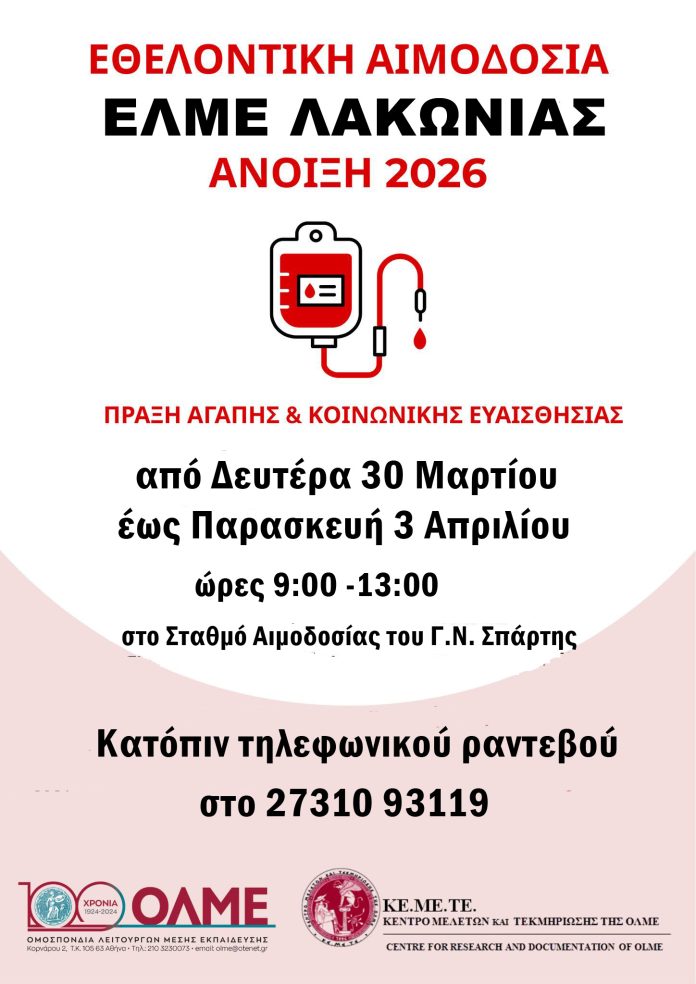 Ως ημέρες ΑΙΜΟΔΟΣΙΑΣ για την ΕΛΜΕ Λακωνίας Δευτέρα 30 Μαρτίου έως Παρασκευή 3 Απριλίου 2026 και ώρα 9:00 π.μ. έως 13.ΟΟ μ.μ. στο σταθμό αιμοδοσίας