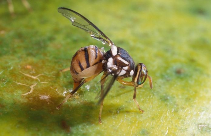 Σε ότι αφορά στα συμπτώματα στους καρπούς, τα νύγματα ωοτοκίας είναι συχνά ορατά στη φλούδα των προσβεβλημένων καρπών. Σε γενικές γραμμές τα συμπτώματα της προσβολής από το έντομο είναι παρόμοια με αυτά που προκαλεί η μύγα της Μεσογείου.